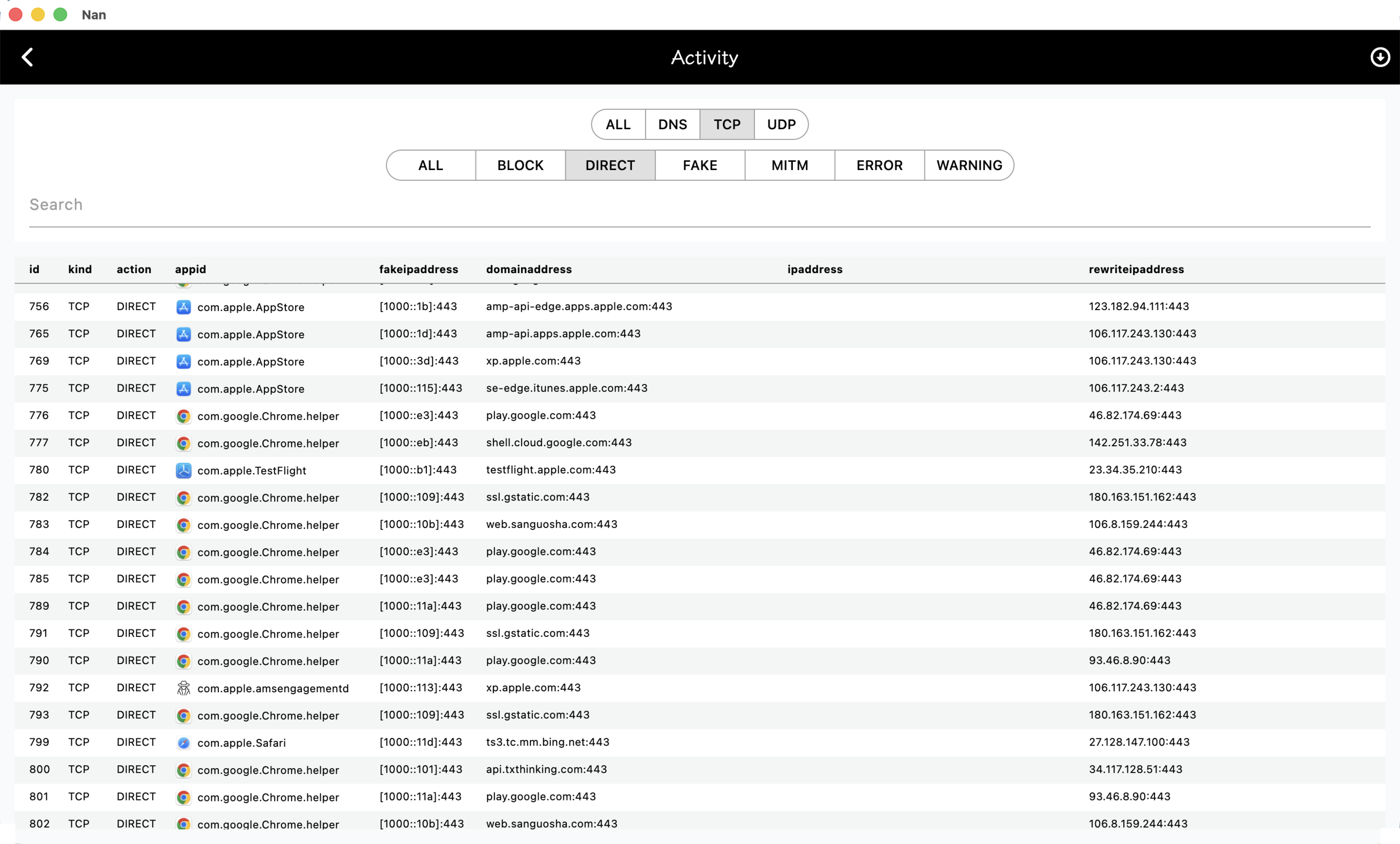 {{zh ? '工作在虚拟网卡级,非系统代理模式,避免有的应用不走代理。DNS, TCP, UDP 和发起网络请求的 AppID。解密 HTTPS 和 WebSocket。Windows 与此视频类似,可获得发起网络请求的应用路径,类似 macOS 上的 App ID。' : 'Works at the virtual NIC level, not in system proxy mode, to prevent some applications from not going through the proxy. DNS, TCP, UDP and AppID for initiating network requests. Decrypt HTTPS and WebSocket. The Windows version is similar to this video, can get application paths for initiating network requests, similar to App ID on macOS.'}}